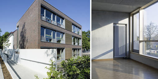 Das Gebäude wendet sich von der stark befahrenen Hauptstrasse ab und orientiert sich zum Schulhof. Dies wird durch die "Gartenmauern" im Aussenbereich unterstützt.