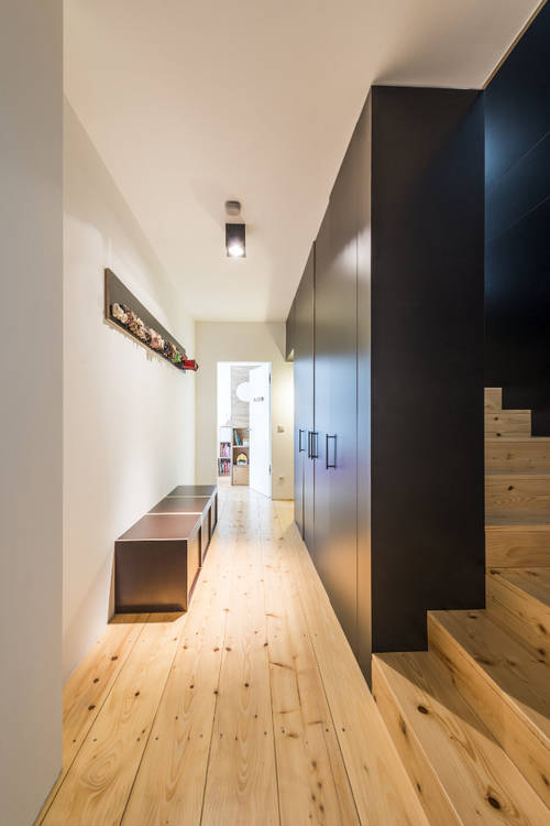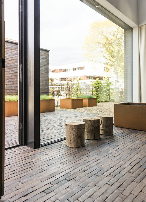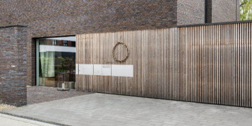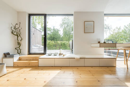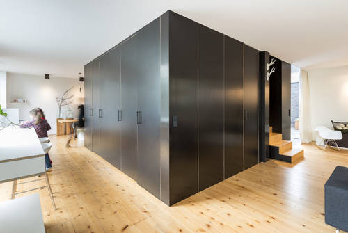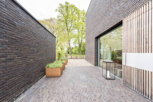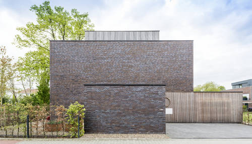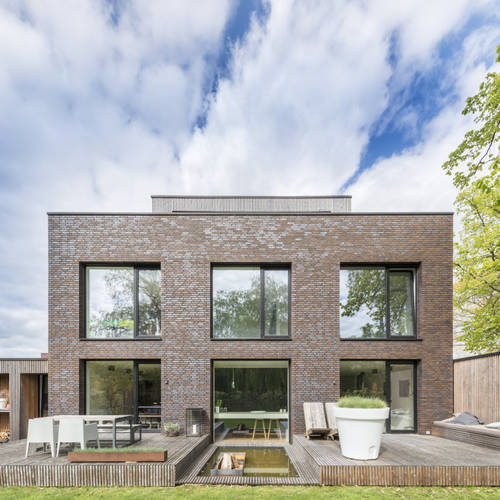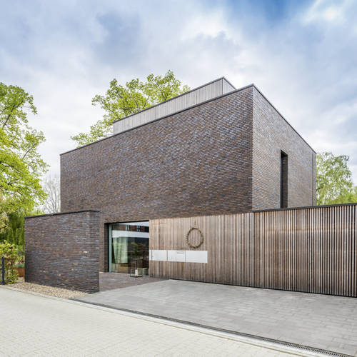 Dieses Einfamilienhaus liegt direkt an der Vechte im Grünen und trotzdem in zentraler Lage von Nordhorn. Das Wohnhaus besteht aus zwei ineinander geschobenen Kuben. Die tragende Struktur wurde in Massivbauweise mit Holzrahmenbau kombiniert. Verwendete Materialien der Fassade sind Verblender und Lärchenholz naturbelassen. Der Innenraum wird durch den eingeschobenen Kubus aus Schaltafeln gegliedert. Innerhalb des Kubus befinden sich Nebenräume, Treppenhaus und jede Menge Stauraum, aussen die Hauptnutzungen. Innen- und Außenraum werden durch entsprechende Materialwahl und Möblierung miteinander verbunden.